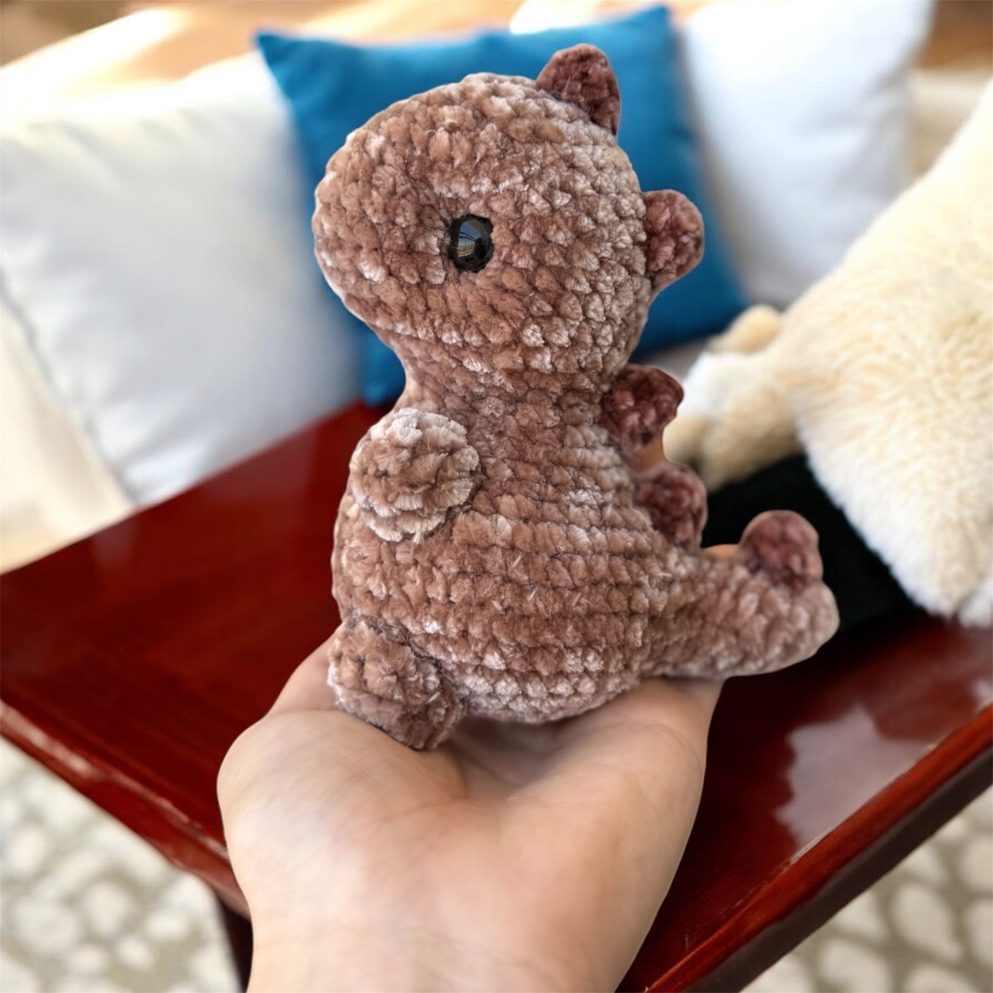 A tiny 5.5” x 4” velvety dinosaur crocheted in mushroom + chocolate tones. Soft, neutral, and made to soothe your shelf, your space, or your bed.